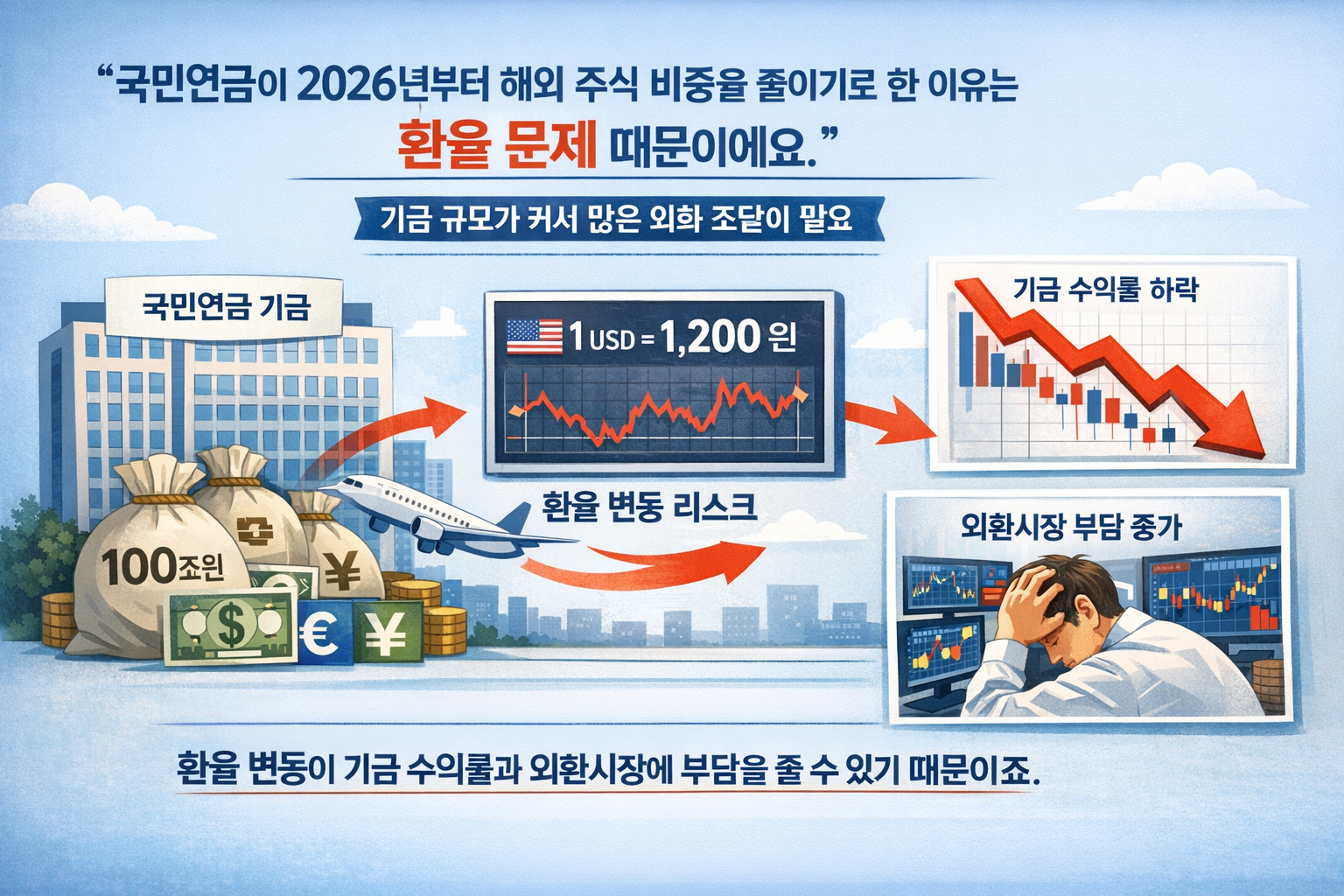 국민연금이 2026년부터 해외 주식 비중을 줄이기로 한 이유는 환율 문제 때문이에요. 국민연금 기금 규모가 커서 해외 투자를 위해 많은 외화를 조달해야 하는데, 환율 변동이 기금 수익률과 외환시장에 부담을 줄 수 있기 때문이죠.
