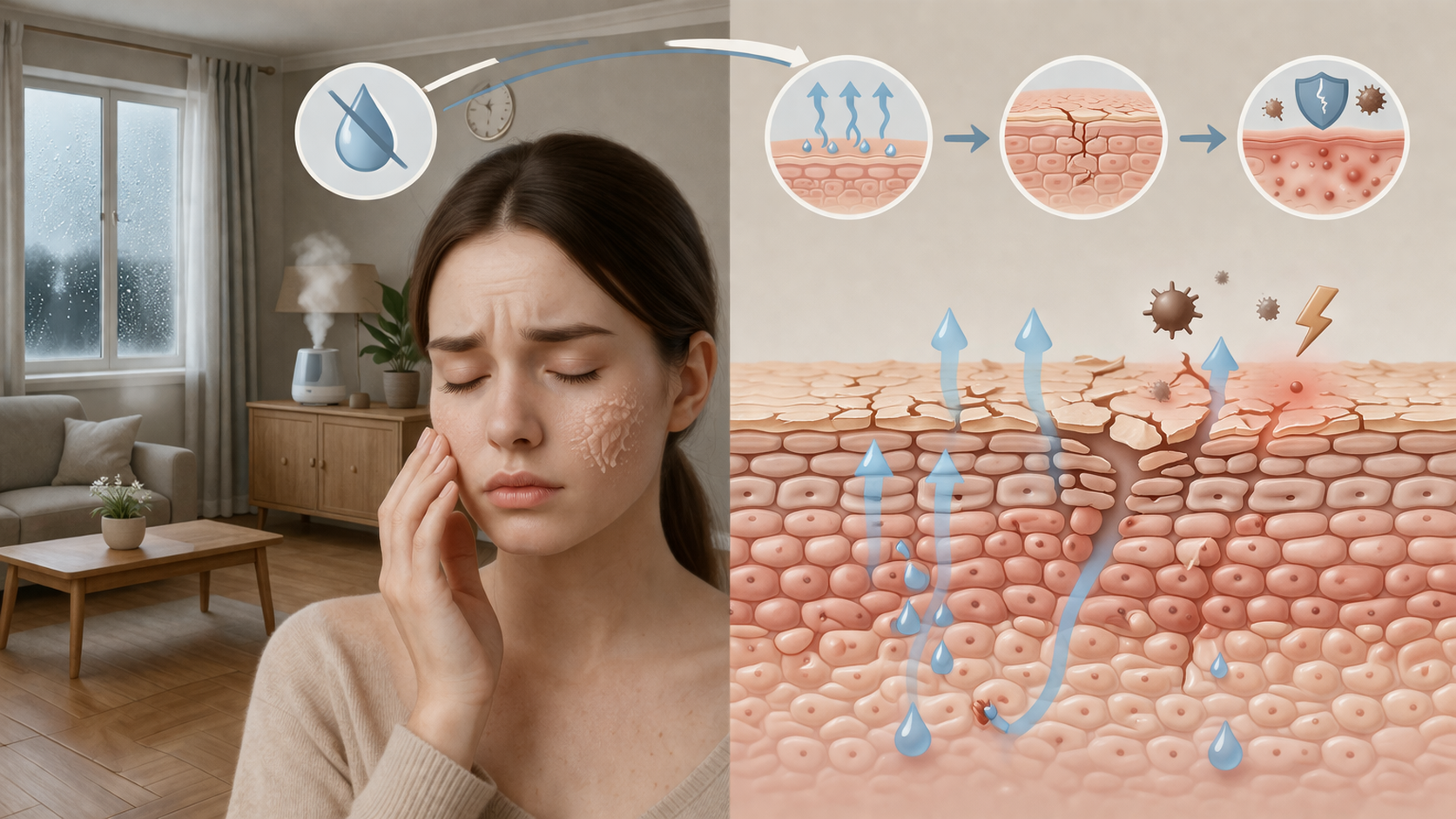 실내 건조함은 우리 몸의 가장 바깥쪽 방어선인 피부에 가장 먼저 영향을 미쳐요. 건조한 공기는 피부 표면의 수분을 빠르게 증발시켜 피부 장벽을 약하게 만들죠. 마치 얇은 보호막이 걷히는 것처럼 말이에요. 이렇게 되면 피부는 외부 자극에 더욱 예민해지고, 거칠어지거나 각질이 일어나기 쉬워져요.