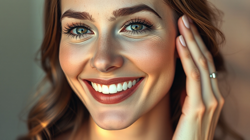 입을 크게 벌린 후 양쪽 광대뼈를 올리며 활짝 미소를 지어보세요. 5초간 유지하고 10회 반복하면 광대 근육이 자극되어 탄력이 살아납니다.