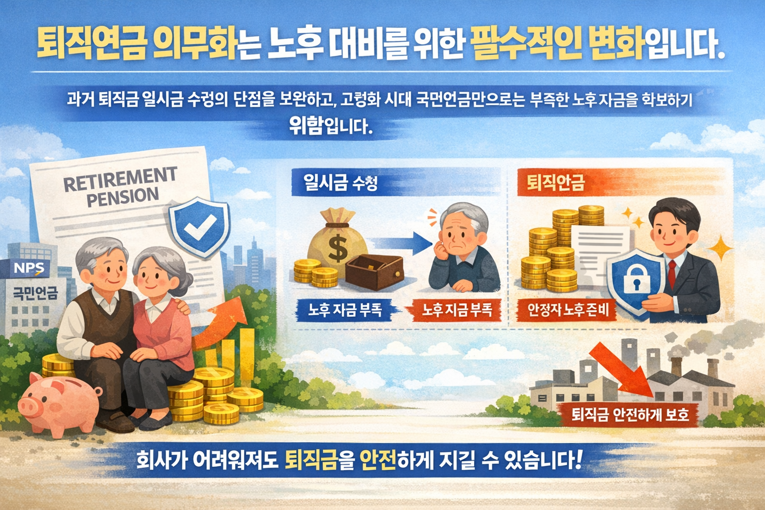 퇴직연금 의무화는 노후 대비를 위한 필수적인 변화입니다. 과거 퇴직금 일시금 수령의 단점을 보완하고, 고령화 시대 국민연금만으로는 부족한 노후 자금을 확보하기 위함입니다. 회사가 어려워져도 퇴직금을 안전하게 지킬 수 있다는 장점도 있습니다.
